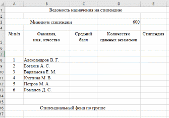 - Рассчитаем стипендиальный фонд группы с помощью автосуммирования ячеек Е8 – Е13