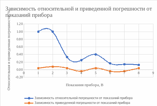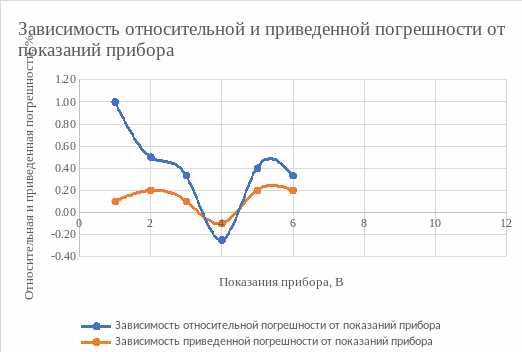 Построим график зависимости относительной и приведенной погрешности от показаний прибора: