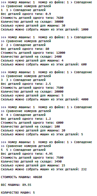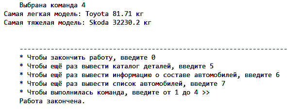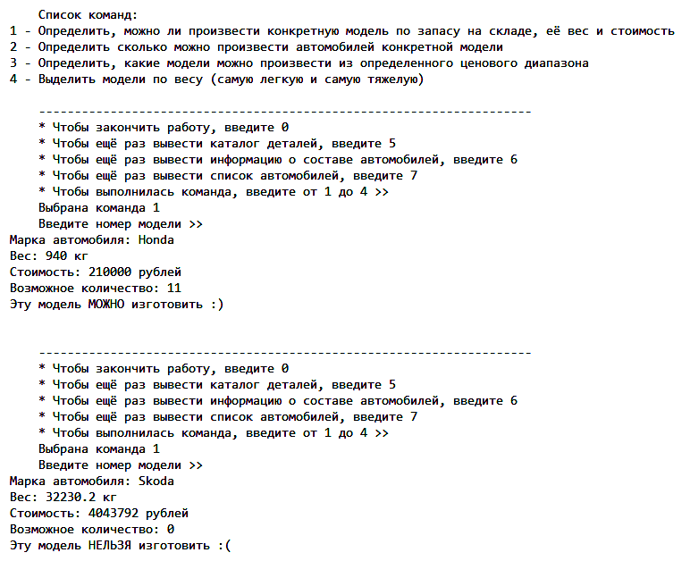 prot << "\nсравнение номеров деталей\n"; F3.cur = F3.head; // машины if (F3.cur == nullptr){ cout << " пустой второй верт. список! " << endl; return;} F3.prev = nullptr; // машины int prov = 0; while (F3.cur != nullptr) // детали{ F3.cur->f_H.cur = F3.cur->f_H.head; int numdet = F3.cur->f_H.cur->podstroka.nomer; prot << numdet << " " << numinf2 << "\n"; int lenn1 = 0; if (numdet == numinf2) { F4.cur->f_H.cur->podstroka.numd = numdet; prov = 1; prot << "совпадение\n"; lenn1 = F3.cur->f_H.cur->podstroka.len; F4.cur->f_H.cur->podstroka.len2 = lenn1; for (int t = 0; t < lenn1; t++) { F4.cur->f_H.cur->podstroka.massiv2[t] = F3.cur->f_H.cur->podstroka.massiv[t];} float ves1 = F3.cur->f_H.cur->podstroka.weight; float cena1 = F3.cur->f_H.cur->podstroka.cena; int kol1 = F4.cur->f_H.cur->podstroka.kol; int sklad_det = F3.cur->f_H.cur->podstroka.sklad; float vesO = ves1 * kol1; float cenaO = cena1 * kol1; prot << "Вес деталей одного типа: " << vesO << "\n";prot << "Стоимость деталей одного типа: " << cenaO << "\n"; prot << "Количество деталей на складе: " << sklad_det << "\n"; prot << "Сколько нужно деталей для машины: " << kol1 << "\n"; VES = (VES + vesO); STOIMOST = (STOIMOST + cenaO); int nabor_det = sklad_det / kol1; prot << "Сколько получится наборов деталей: " << nabor_det << "\n"; if (NABOR < 0) { NABOR = nabor_det;} else { if (NABOR > nabor_det) { NABOR = nabor_det;}} prot << "сколько можно собрать машин из этих деталей: " << nabor_det << "\n"; F1.cur->f_H.cur->podstroka.Weight = VES; F1.cur->f_H.cur->podstroka.Stoim = STOIMOST; F1.cur->f_H.cur->podstroka.Kolvo = NABOR; break;} else { prov = 2; } // номер не совпал F3.prev = F3.cur; F3.cur = F3.cur->next;} if (prov == 2) { // если ни один номер не совпал, значит такого нет F4.cur->f_H.cur->podstroka.len2 = -1;} break;} else { PROV = 2; } // номер не совпал F1.prev = F1.cur; F1.cur = F1.cur->next;} if (PROV == 2) { // если ни один номер не совпал, значит такого нет F4.cur->f_H.cur->podstroka.len = -1;} F4.prev = F4.cur; F4.cur = F4.cur->next;} prot << "\nСТОИМОСТЬ МАШИНЫ: " << STOIMOST << "\n"; prot << "\nВЕС МАШИНЫ: " << VES << "\n"; prot << "\nКОЛИЧЕСТВО МАШИН: " << NABOR << "\n"; if ((light >= VES) && (VES != 0)) { light = VES; F1.Lightt = light;} if ((heavy <= VES) && (VES != 0)) { heavy = VES; F1.Heavyy = heavy;} prot << "\n\nсамый тяжелый: " << heavy; prot << "\n\nсамый легкий: " << light << "\n";} void Process(std::ofstream& res, std::ofstream& prot, std::string in_filename, std::string in_filename2, std::string in_filename3, std::string in_filename4){ ifstream cars; ifstream firms; ifstream details; ifstream info; cars.open(in_filename, std::ios_base::in); firms.open(in_filename2, std::ios_base::in); details.open(in_filename3, std::ios_base::in); info.open(in_filename4, std::ios_base::in); FormularV f1; FormularV f2; FormularV f3; FormularV f4; if (Read_file(cars, res, f1)) { ; } if (Read_file(firms, res, f2)) { ; } if (Read_fileDetails(details, res, f3)){ FUNCTION(res, f2, f3); Print_fileDetails(res, f3);} if (Read_fileINFO(info, res, f4)){ prot << " процесс: " << "\n\n";} FUNCTION1(res, prot, f1, f2, f3, f4); Print_fileINFO(res, f4); cout << "\nСписок автомобилей\n\n"; res << "\n\n Список автомобилей\n\n"; Print_file(res, f1); cout << " Список команд:\n"; cout << " 1 - Определить, можно ли произвести конкретную модель по запасу на складе, её вес и стоимость\n"; cout << " 2 - Определить сколько можно произвести автомобилей конкретной модели\n";cout << " 3 - Определить, какие модели можно произвести из определенного ценового диапазона\n"; cout << " 4 - Выделить модели по весу (самую легкую и самую тяжелую)\n"; res << " Список команд:\n"; res << " 1 - Определить, можно ли произвести конкретную модель по запасу на складе, её вес и стоимость\n"; res << " 2 - Определить сколько можно произвести автомобилей конкретной модели\n";res << " 3 - Определить, какие модели можно произвести из определенного ценового диапазона\n"; res << " 4 - Выделить модели по весу (самую легкую и самую тяжелую)\n"; int Case = -1; int Case_car = -1; int Price1 = -1; int Price2 = -1; while (Case != 0) { cout << "\n -"; cout << "\n * Чтобы закончить работу, введите 0"; cout << "\n * Чтобы ещё раз вывести каталог деталей, введите 5"; cout << "\n * Чтобы ещё раз вывести информацию о составе автомобилей, введите 6"; cout << "\n * Чтобы ещё раз вывести список автомобилей, введите 7"; cout << "\n * Чтобы выполнилась команда, введите от 1 до 4 >> "; res << "\n -"; res << "\n * Чтобы закончить работу, введите 0"; res << "\n * Чтобы ещё раз вывести каталог деталей, введите 5";res << "\n * Чтобы ещё раз вывести информацию о составе автомобилей, введите 6";res << "\n * Чтобы ещё раз вывести список ав