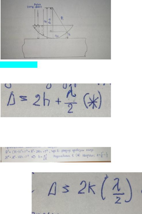 Вывод формулы: оптическая разность хода между лучами, отраженными от верхней и нижней поверхностей зазора на произвольном расстоянии r от оси линзы, которой соответствует толщина зазора h:
