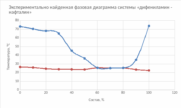 Вывод: в результате измерения лабораторной работы были получены данные для последующего построения кривых охлаждения смесей дифинеламина и нафталина. На основе кривых охлаждения получена диаграмма состояния системы «дифинеламин-нафталин», которая является диаграммой состояния системы с простой эвтектикой.