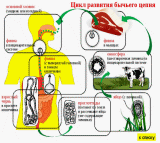 Жизненный цикл. Единственным окончательным хозяином свиного цепня является человек, он же может быть и промежуточным хозяином, так что при одном возбудителе заболевания может возникнуть при различных обстоятельствах два заболевания. Зона локализации паразита - тонкий кишечник. Человек заражается тениозом при употреблении в пищу свиного мяса, содержащего живых цистицерков. Через 2 - 3 месяца после заражения, начинают выделяться членики, содержащие онкосферы. Членики выделяются пассивно с фекалиями, чаще в виде ленты. Промежуточными хозяевами являются свиньи, но, как установлено, могут быть и другие животные - дикий кабан, медведь, верблюд, собака, кошка, кролик, заяц. Заражение промежуточного хозяина происходит при заглатывании онкосфер с пищей или водой. В кишечнике промежуточного хозяина онкосфера выходит из эмбриофоры, внедряется в стенку кишечника, проникает в кровеносные или лимфатические сосуды и заносится кровотоком в межмышечную соединительную ткань, мозг, глаза, сердечную мышцу и другие органы. Через 20 дней появляются зачатки сколекса. Через 40 - 50 дней цистицерки уже имеют развитый сколекс, а через 3 - 4 месяца заканчивают свое развитие. В дальнейшем они обрастают соединительнотканной капсулой хозяина. Продолжительность жизни цистицерков у свиней от 3 до 6 лет, после чего они сморщиваются, пропитываются известью, погибают. У человека цистицерки менее жизнеспособны, срок их жизни не более 2 лет.