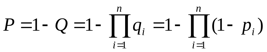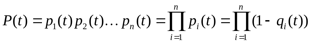 Если предположить отказы элементов независимы, то для системы с последовательным соединением элементов вероятность одновременной безотказной работы всех n элементов определяется по теореме умножения вероятностей безотказной работы каждого из элементов: вероятность совместного появления независимых событий равна произведению вероятностей этих событий.