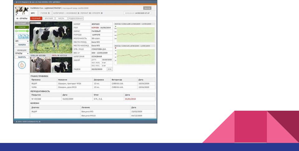 •быстрое получение оперативной информации о животном: состояние здоровья, воспроизводительной функции, надой валовой и за каждую дойку, качество молока;