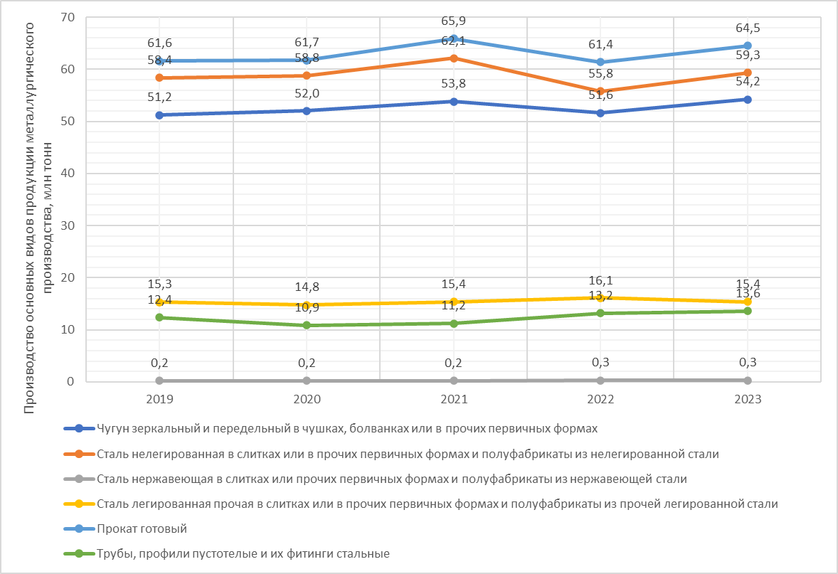 Рисунок 1. Динамика производства основных видов продукции металлургического производства с 2019 по 2023 годы