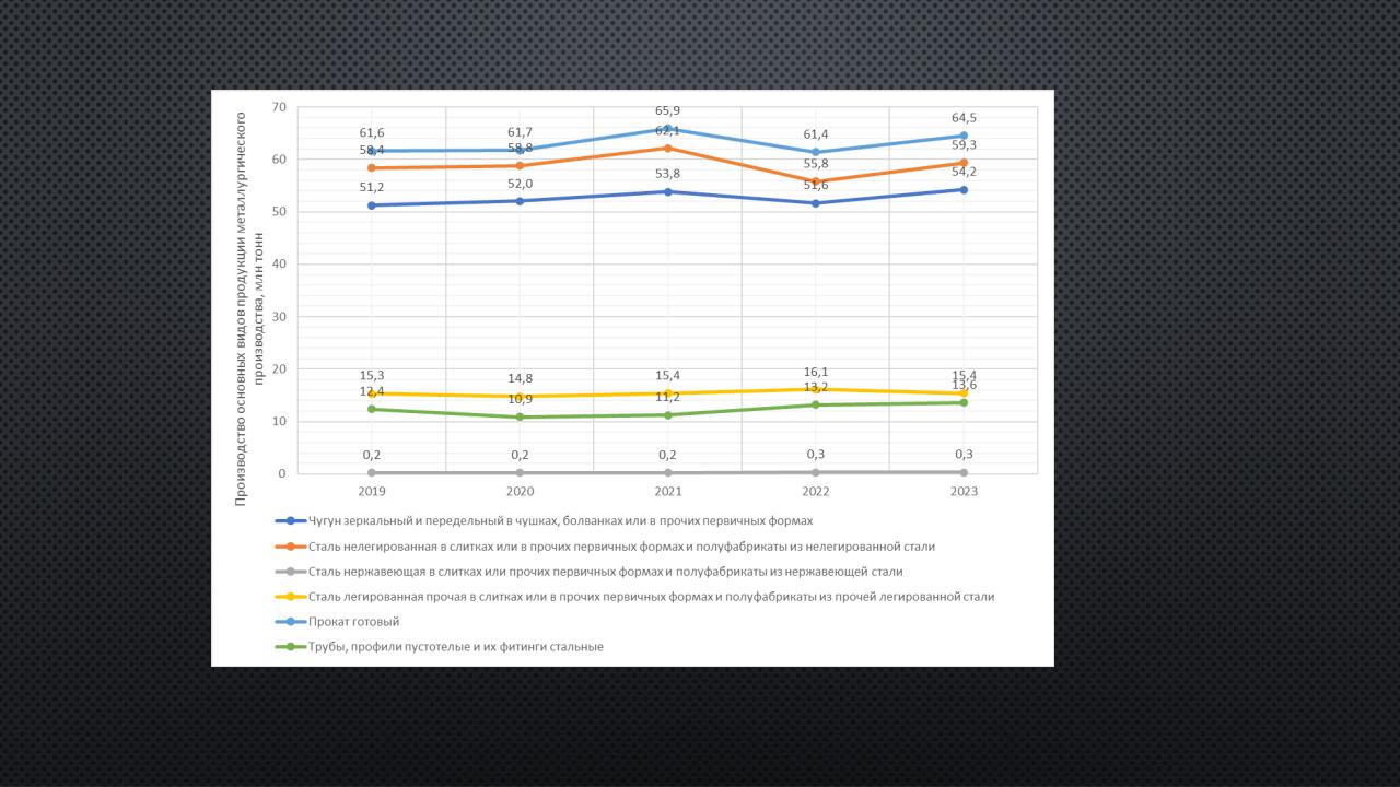 •1. ЧУГУН ЗЕРКАЛЬНЫЙ И ПЕРЕДЕЛЬНЫЙ В ЧУШКАХ, БОЛВАНКАХ ИЛИ В ПРОЧИХ ПЕРВИЧНЫХ ФОРМАХ: ИСПОЛЬЗУЕТСЯ ДЛЯ РАСКИСЛЕНИЯ И ПОВТОРНОГО НАУГЛЕРОЖИВАНИЯ (ВНЕСЕНИЕ УГЛЕРОДОСОДЕРЖАЩИХ МАТЕРИАЛОВ) СТАЛИ, А ТАКЖЕ ДЛЯ ЛЕГИРОВАНИЯ (УЛУЧШЕНИЯ) МАТЕРИАЛА. ИСХОДЯ ИЗ РИСУНКА 1, МОЖНО УВИДЕТЬ, ЧТО ОН НАХОДИТСЯ НА 3 МЕСТО СРЕДИ ОСНОВНЫХ ВИДОВ ПРОДУКЦИИ В ПРОМЫШЛЕННОСТИ, ПРИ ЭТОМ ЕГО ДИНАМИКА ЯВЛЯЕТСЯ СТАБИЛЬНОЙ И ИДЕТ НА РОСТ В 2023 ГОДУ, ЧТО ГОВОРИТ О МОБИЛИЗОВАННОСТИ РАБОЧИХ РЕСУРСОВ С УЧЕТОМ ДАЛЬНЕЙШЕГО ПРИМЕНЕНИЯ ЧУГУНА В РАЗЛИЧНЫХ ОТРАСЛЕВЫХ ПРЕДПРИЯТИЯХ (В ОСОБЕННОСТИ ТЕХ, ЧТО КАСАЮТСЯ ВНЕШНЕПОЛИТИЧЕСКИХ СОБЫТИЙ);