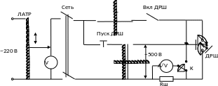 Питание лампы ДРШ осуществляется от сети переменного тока напряжением 220 В через специальный блок (рис. 6.1). Блок питания выполняет две функции: возбуждение разряда в лампе и ограничение разрядного тока. Первоначально включается тумблер «Сеть», затем – тумблер «Вкл ДРШ». Далее при кратковременном, на 1…2 с, нажатии кнопки «Пуск» к дополнительному электроду лампы прикладывается напряжение 500 В от повышающей вторичной обмотки поджигающего трансформатора. Это напряжение пробивает газовый промежуток между вспомогательным и основными электродами. Через доли секунды после возникновения вспомогательного разряда концентрация заряженных частиц в объеме лампы становится достаточной для перехода разряда на основные электроды.