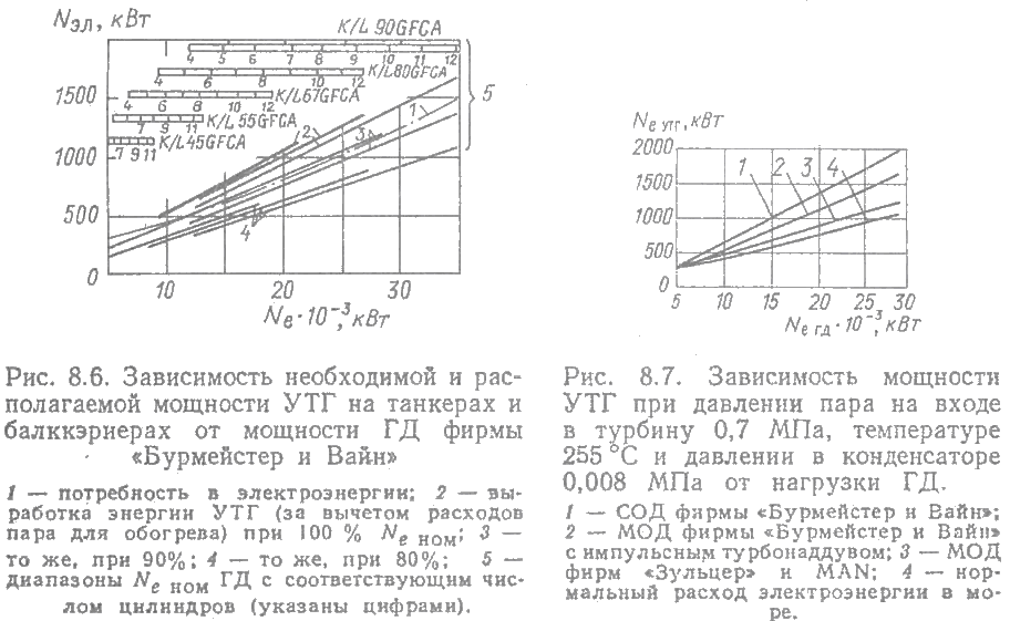 Только при мощности главного двигателя более 13 тыс. кВт (для режима не менее 90 %) cистемы глубокой утилизации теплоты современных малооборотный дизель фирмы «Бурмейстер и Вайн» обеспечивают выработку избыточной энергии и полностью удовлетворяют потребности судов на ходовом режиме в паре и электроэнергии (рис. 8.6—8.8). По опыту эксплуатации малооборотный дизель фирма «Бурмейстер и Вайн» считает, что избежать необходимости частого запуска дизель-генератора можно лишь при условии, если выработка электроэнергии утилизационный турбогенератор будет удовлетворять потребности судна при мощности главного двигателя не менее 80 %.