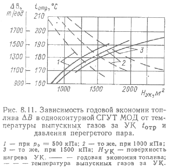 — применение для подогрева конденсатора в цикле cистемы глубокой утилизации теплоты пресной воды, охлаждающей воздух в первой секции ВО; — применение пара низких параметров, имеющих больший удельный объем; при неизменной поверхности нагрева утилизационных котлов переход от давления пара 1500 к 500 кПа в простой схеме глубокой утилизации теплоты малооборотный дизель дает возможность получить дополнительную экономию топлива и приведенных затрат до 10 % (рис. 8.11).