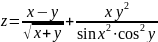 z = ((x - y) / sqrt(x + y)) + (x * pow(y, 2) / sin(pow(x, 2)) * pow(cos(y), 2));