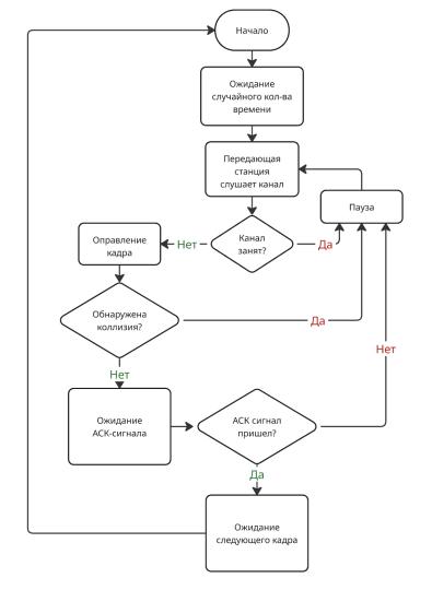 Передача данных: Когда канал свободен и время ожидания истекло, устройство передает свои данные. Оно также устанавливает таймер ACK, чтобы следить за успешной передачей данных.