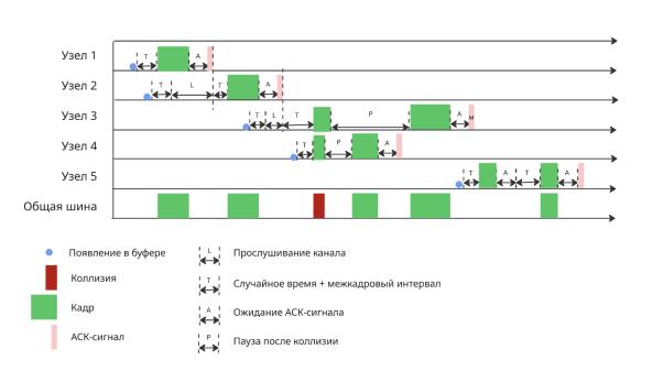 Повторные попытки: Если произошла коллизия или подтверждение не было получено, устройство выбирает новое случайное время ожидания и повторяет процесс снова.
