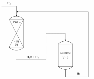 В реакторе 1500 кг катализатора с содержанием никеля 48% в виде NiO. Рассчитать расход водорода, количество выделившейся воды. Определить объем необходимого количества адсорбента - цеолита для удаления влаги, если влагоемкость цеолита 20 %, а насыпная масса 0,65 г/см3.