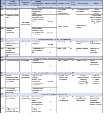 Для значимых бизнес-процессов приведены действия, описаны прикладные системы, идентифицированы сервисы и бизнес-операции, сведено в таблицу 3.