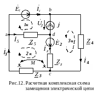 Расчетная схема с комплексными источниками ЭДС и тока и комплексными сопротивлениями ветвей показана на рис.12.