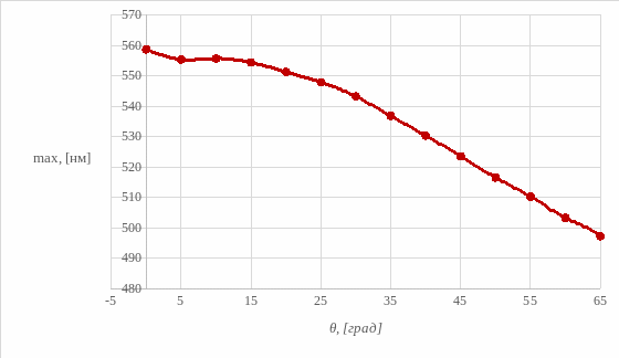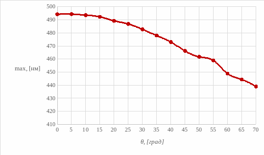 Рисунок 4 – График зависимости длины волна максимального пропускания от угла падения света для светофильтра №1