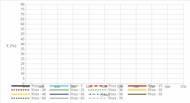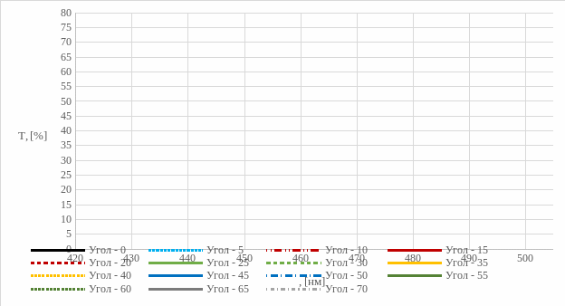 Рисунок 2 – График спектральных зависимостей коэффициента пропускания для углов поворота от 0º до 70º для светофильтра №1