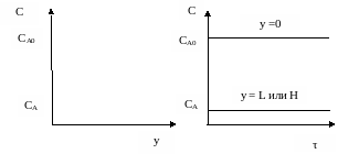 Концентрация исходного реагента А постепенно меняется по длине или высоте реактора от начального значения СА0 до конечного значения СА. Следствием такого режима движения реакционной смеси является то, что время пребывания каждой частицы в реакторе одно и то же.