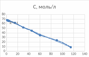 По представленной на каждом из графиков величине достоверности аппроксимации R2 и характеру кривой, делаем вывод, что реакция 1-го порядка, так как в этом случае величина достоверности аппроксимации принимает наиболее близкое к единице значение, равное 0,9969.