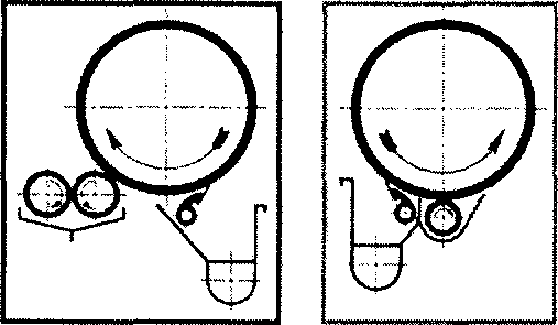 Существует несколько способов нанесения молока на вальцы.Наиболее совершенным следует считать способ нанесения сгущенного молока на вальцы сдуванием с дисков,т.к. при этом на вальцы наносится очень тонкий слой молока, который обдувается воздухом в начале испарения, вследствие чего значительно сокращается продолжительность сушки и повышается качество продукта, особенно его растворимость.