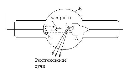Трубка представляет собой стеклянную колбу – Б с высоким вакуумом порядка 10-6 – 10-7 мм.рт.ст. А – анод (металл). На скошенном торце пластика З (зеркальце). К – катод (в виде спирали). Между анодом и катодом приложено высокое напряжение, достигающее 105 вольт. Электроны электрическим полем разгоняются до скоростей V=100 000 км/с, и ударяются об анод. проникают вглубь зеркальца, взаимодействуют с атомами вещества и тормозятся полем его атомов. Происходит коротковолновое электромагнитное излучение, которое называется тормозным рентгеновским излучением. И имеет сплошной спектр.