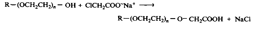 Этоксилированные спирты можно превращать в карбоксилаты, т. е. этоксилированные алкилкарбоксилаты. Традиционно это делали с использованием монохлорацетата натрия: