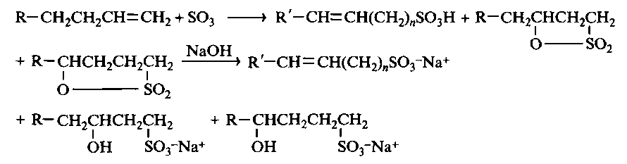 Сульфонаты а-олефинов получают по реакции линейных а-олефинов с три-оксидом серы; в результате получается смесь алкенсульфонатов, 3- и 4-гидроксиалкансульфонатов и некоторого количества дисульфонатов и других веществ. В качестве исходного сырья используют в основном две оле-финовые фракции: С12-С16 и С16-С18. Отношение алкенсульфонатов к гидро-ксиалкансульфонатам в некоторой степени регулируется соотношением количеств вводимых в реакционную смесь SO3 и олефинов: чем выше это соотношение, тем больше образуется алкенсульфоновой кислоты. Образование гидроксиалкансульфокислоты происходит через промежуточный циклический сультон, который затем расщепляется щелочью. Сультон токсичен, поэтому важно, чтобы его концентрация в конечном продукте была очень низкой. Схему получения можно записать следующим образом: