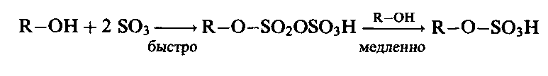 Сульфированные сирты и этоксилированные спирты составляют другую важную группу анионных ПАВ, нашедших широкое применение в моющих средствах. Это моноэфиры серной кислоты, в которых сложноэфирная связь очень лабильна и относительно легко разрывается при низких рН в результате автокаталитического гидролиза. В качестве сырья для этого типа ПАВ используют линейные и разветвленные спирты с числом атомов углерода от 8 до 16. При использовании линейного спирта с 12 атомами углерода получают додециловый эфир серной кислоты, а после нейтрализации каустической содой образуется додецилсульфат натрия — наиболее важное ПАВ такого типа. Этоксилированные спирты, обычно используемые в качестве промежуточных продуктов, представляют собой алифатические спирты с двумя или тремя оксиэтиленовыми звеньями. Процесс аналогичен рассмотренному выше сульфированию. В промышленном производстве в качестве реагента используют триоксид серы,