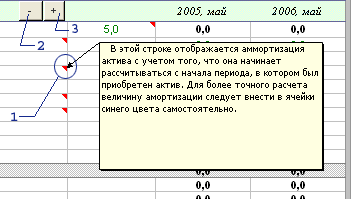 Большинство таблиц на листе “Plan” оснащено примечаниями. Примечание – это красный треугольник, находящийся в правом вернем углу ячейке, подведя к которой мышку можно получить пояснение как, что, либо в каком формате следует заводить в нее, либо в строку, в которой она находится (см. рис. №12 – пункт 1).