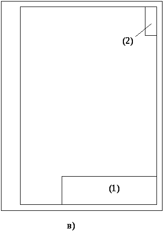 Рисунок 9.1 – Расположение основных надписей (1) и дополнительных граф (2): а) – для формата А4; б) – для формата больше А4 при расположении основной надписи вдоль длинной стороны листа; в) – для формата больше А4 при расположении основной надписи вдоль короткой стороны листа |
