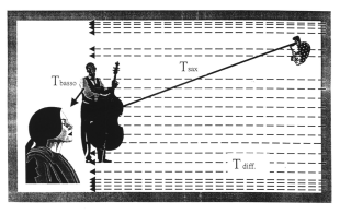 поступает через время Tdiff. после каждой акустической атаки. Звук саксофона доходит до точки прослушивания за время Tsax., сопоставимое с Tdiff., так что разность Tdiff.-Tsax. стремится к нулю. Что же касается звуков контрабаса, слышимых через время Tbasso после их возникновения, то воспринимаемая диффузная окраска этого инструмента задержана на вполне ощутимую