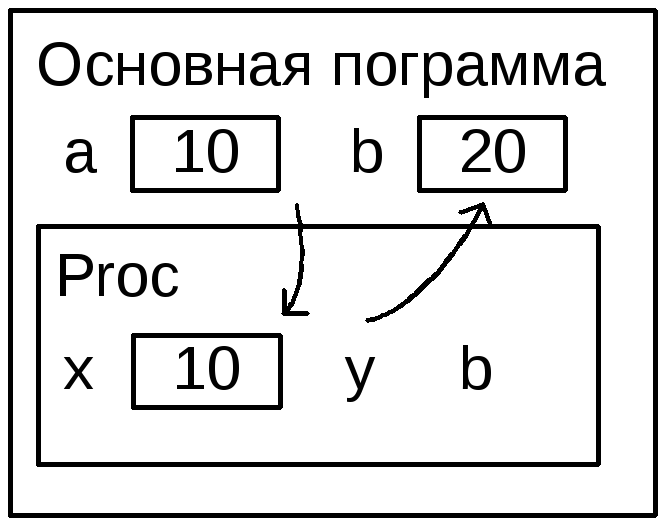 В подпрограмму передается адрес фактического параметра, а не его копия. (Формальный параметр считается синонимом соответствующего фактического параметра). Поэтому фактический параметр, соответствующий параметру-переменной, должен быть переменной того же типа, что и формальный параметр (константы или выражения не допускаются).