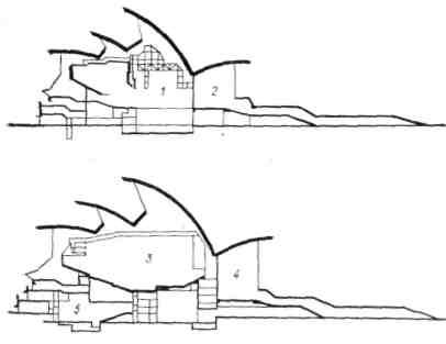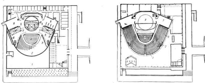 а — вариант сцены-коробки со зрительным залом на 600 мест; б — вариант пространственной сцены со зрительным залом на 450 мест; 1 — поворотная часть амфитеатра; 2 — амфитеатр; 3 — сцена; 4 — занавес; 5 — экран