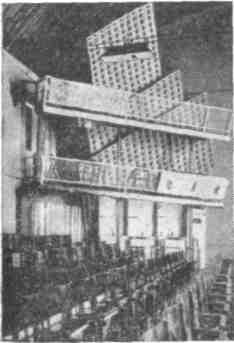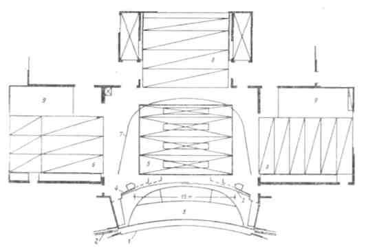 Наиболее наглядно новые принципы простроения припор-тальной зоны продемонстрированы на сцене Театра торжественных представлений в г. Зальцбурге (автор проекта архитектор-инженер К. Хольмейстер). Передняя сцена этого театра состоит из обширной авансцены, глубиной 7 м, и боковых площадок, охватывающих десять рядов партера (рис. 194). В передней части авансцены размещен подъемно-опускной оркестр. Панели, ограничивающие боковые сцены, могут откатываться в глубину, открывая дополнительные игровые пространства, размером 5x x12 м каждая. Для организации выходов в панелях предусмотрены открывающиеся створки. Здесь же смонтированы световые установки для освещения как передней, так и главной сцены.