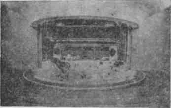 ¶от общепринятых конструкций. Вопреки традициям, он сделан не сплошной стеной, а разделен по высоте на две части. Верхняя, составляющая 7з высоты занавеса, поднимается наверх, проходя через щель в потолке зрительного зала. Подошва этой части обработана декоративно под потолок, и поэтому в поднятом виде занавес совершенно не заметен. Нижняя часть выступает над полом зрительного зала и служит барьером, ограждающим оркестровую яму (рис. 193). При закрытии занавеса обе части движутся навстречу друг другу, надежно перекрывая сцену. Оригинальная конструкция, получившая название «акулья пасть», помимо всего, значительно сократила время, необходимое для изоляции сцены, и обеспечила высокую степень безопасности для работающих на сцене людей.
