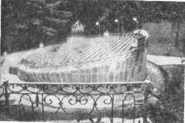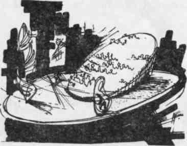 ¶от общепринятых конструкций. Вопреки традициям, он сделан не сплошной стеной, а разделен по высоте на две части. Верхняя, составляющая 7з высоты занавеса, поднимается наверх, проходя через щель в потолке зрительного зала. Подошва этой части обработана декоративно под потолок, и поэтому в поднятом виде занавес совершенно не заметен. Нижняя часть выступает над полом зрительного зала и служит барьером, ограждающим оркестровую яму (рис. 193). При закрытии занавеса обе части движутся навстречу друг другу, надежно перекрывая сцену. Оригинальная конструкция, получившая название «акулья пасть», помимо всего, значительно сократила время, необходимое для изоляции сцены, и обеспечила высокую степень безопасности для работающих на сцене людей.