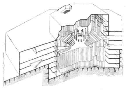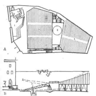 В новых Дворцах спорта предусмотрены простые средства трансформации, позволяющие довольно успешно сочетать спортивную и театрально-концертную деятельность. Здания многоцелевого назначения играют заметную роль в культурной жизни разных народов. Но что касается театра, то сооружения подобного характера не могут удовлетворить даже самые основные требования, предъявляемые этим видом искусства. Передвижные зрительные залы, отсутствие надлежащей механизации для перемены декораций и их движения во время действия, весьма примитивное обозначение той или иной формы сцены создают лишь внешние признаки театра, отрывают его от присущей каждому типу сцены архитектуры. Так, например, обозначение занавесами или панелями сцены-коробки еще не означает действительной организации сцены этого типа. Сцена-коробка, как и всякая другая, это комплекс взаимосвязанных между собой элементов техники, архитектуры и пр., а не только формальное разделение сцены и зала портальной плоскостью. Другое дело, когда мы встречаемся со специально построенным театральным зданием, рассчитанным только на театральные постановки, в котором предусмотрена возможность