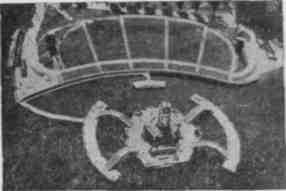 Наиболее наглядно новые принципы простроения припор-тальной зоны продемонстрированы на сцене Театра торжественных представлений в г. Зальцбурге (автор проекта архитектор-инженер К. Хольмейстер). Передняя сцена этого театра состоит из обширной авансцены, глубиной 7 м, и боковых площадок, охватывающих десять рядов партера (рис. 194). В передней части авансцены размещен подъемно-опускной оркестр. Панели, ограничивающие боковые сцены, могут откатываться в глубину, открывая дополнительные игровые пространства, размером 5x x12 м каждая. Для организации выходов в панелях предусмотрены открывающиеся створки. Здесь же смонтированы световые установки для освещения как передней, так и главной сцены.