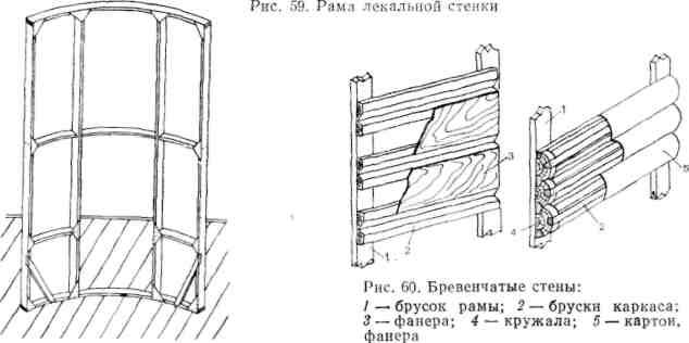 Затем по линиям чертежа раскладываются и обрезаются по размерам бруски, из которых собирается рама. Сечение брусков выбирается из конструктивных соображений, зависящих от величины стенки, режима эксплуатации, предполагаемого срока службы и т. д. Самым рациональным сечением, принятым всеми театрами, является 2,5X6 или 3x7 см. Большее сечение нецелесообразно, так как только увеличивает вес декораций, не влияя решающим образом на их прочность.