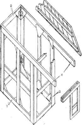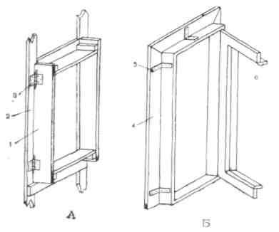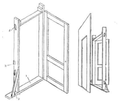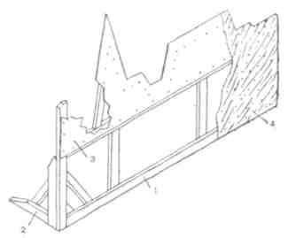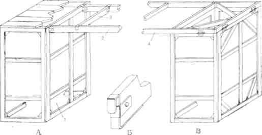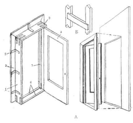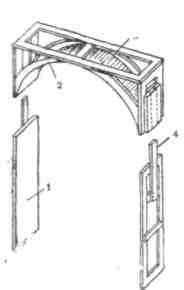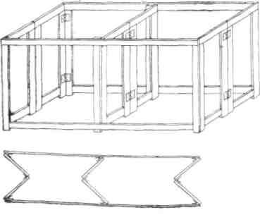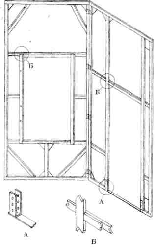 В стенках с дверным проемом по всей высоте рамы, в соответствии с шириной проема, пропускается два вертикальных бруска (рис. 54). Внизу соединение производится вполдерева, а наверху встык. Стыковое соединение обязательно подлежит усилению косынкой. Высота проема ограничивается горизонтальным бруском, пропускаемым по всей ширине рамы. Этот брусок прибивается к раме внакладку и одновременно служит раскрепляющим средником. Так как он выходит из плоскости рамы, к нему на ширину проема прибивается дополнительный брусок. Этот брусок заполняет перепад высот, выравнивая