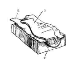 ¶Тиснение от руки выполняется главным образом по плюшу. На растянутый плюш углем наносят рисунок и жесткой кистью, смоченной в воде, укладывают ворс в разных направлениях. Этим способом изготавливают декоративные панно, ковры, занавесы и другие изделия с орнаментальной или сюжетной композицией.