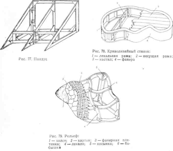 ¶струкцию вводятся дополнительные бруски, называемые ручниками, средниками и раскосами (рис. 53). Все эти бруски прибиваются к основной раме только внакладку, без врезки. Бруски, прикрепленные к раме в одной плоскости с основными, в процессе эксплуатации быстро проступят сквозь холст и испортят вид декорации.