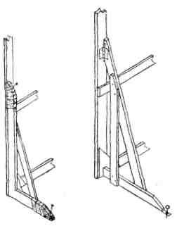 Для жесткого фиксирования углов рамы недостаточно фанерных косынок. Бруски-раскосы, схватывающие две стороны угла, надежно закрепляют угол, препятствуя его расшатыванию. Верхние концы нижних раскосов прибиваются к вертикальному бруску рамы под ручником, образуя по отношению к нему угол, равный примерно 45°.