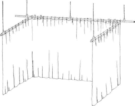 ¶колосниковые блоки. Полотно горизонта привязывается к штан-кету и боковым трубам. При натяжении веревок боковые трубы принимают горизонтальное положение, раскрывая горизонт (рис. 50). Сильная и равномерная натяжка полотна достигается применением второго изогнутого штанкета, прикрепляемого к обратной стороне горизонта на высоте 20—25 см от планшета.