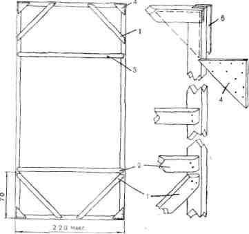Рама стенки вяжется вполдерева или, как еще говорят, в лапу. При этом соединении концы брусков «выбираются» в половину их толщины, а на расстоянии от края — в ширину соединяемых брусков. Соединение покрывается жидким столярным клеем и пробивается двумя или тремя гвоздями с обязательным загибанием концов, выступающих на лицевую сторону. Поэтому длина гвоздей должна быть на 15—20 мм больше толщины брусков. Помимо этого, угловые соединения укрепляются фанерной косынкой, тоже с применением клея и гвоздей. Для того чтобы рама была прочной и жесткой, в ее кон-
