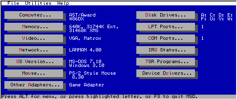 У поставку цієї операційної системи входить програма MSD.EXE і знаходиться звичайно в директорії DOS. Запустити її можна, просто набравши MSD з командного рядка. Якщо при запуску програма "зависає", можна запустити її з ключем /i.