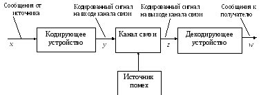 На вход такого канала обычно поступают дискретные соотношения х, например, в виде текста. Последние с помощью кодирующего устройства преобразуются в кодированные сигналы у. Как известно, для кодирования используется некоторый алфавит элементарных сигналов (символов) – у1, у2,…, уm, а существо кодирования сводится к представлению отдельных сообщений хi или последовательностей сообщений некоторыми комбинациями символов используемого алфавита. Декодирующее устройство преобразует кодированные сигналы z в сообщения w в форме, наиболее приемлемой для получателя, которым может быть не только человек, но и различные технические устройства (принтер, монитор, ПЭВМ и др.). В современных информационно-вычислительных комплексах исходные сообщения х могут быть и в непрерывной форме, но с помощью кодирующих устройств последние преобразуют в кодированные сигналы.