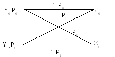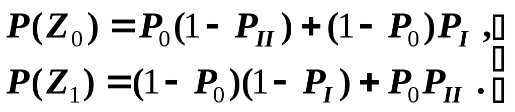 Очевидно, что при данных обозначениях вероятности правильного решения будут P(z0y0) = 1 – PII и P(z1y1) = 1 - PI. Для краткости записи обозначим априорные вероятности передачи сигналов P(y0) = P0 и P(y1) = P1 = 1 - P0 . Для рассматриваемого двоичного канала введенные обозначения схематично показаны на рис. 2 в виде следующей модели.