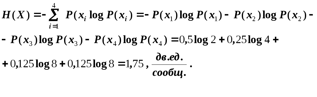Для определения скорости передачи информации вновь воспользуемся формулой (1.2), для которой необходимо вычислить соответствующее значение энтропии Н(х) для источника разновероятных сообщений х1, х2, х3, х4 (n = 4):