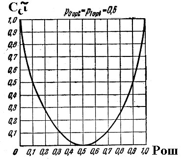 Как видно из этого графика, при Рош = 0,5 пропускная способность канала Сс = 0. Этот результат станет очевидным, если учесть, что для значения Рош = 0,5 при передаче каждого из символов на выходе канала с равной вероятностью может быть принято решение z0 и z1. Эти решения могут иметь такую же ценность, как если бы передача сигналов прекратилась и на выходе канала принималось бы решение по результатам бросания монеты (цифра или герб). Интересно также отметить, что если Рош 0,5, то с увеличением Рош пропускная способность канала возрастает. Этот, на первый взгляд, парадоксальный вывод становится очевидным, если принять во внимание, что мы всегда можем изменить правило распознавания символов на обратное, т.е. считать, что решение z1 соответствует передаче символов у0, а решение z0 – передаче символа у1. Тогда вероятность принятия ошибочного решения станет равной 1 – Рош.